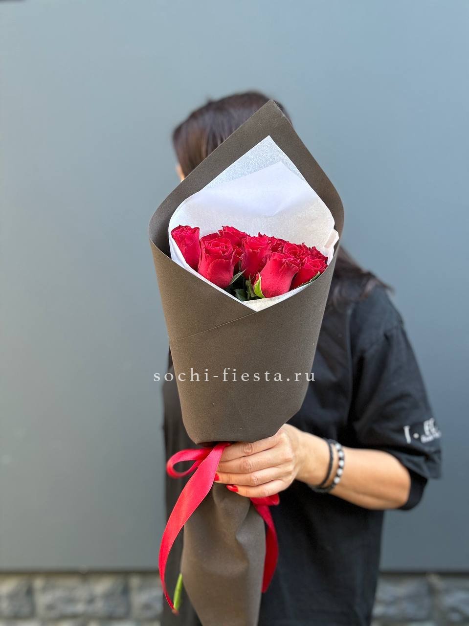Девять красных бутонов в обрамлении свежего эвкалипта и крафтовой обёртки. Лаконичная сборка для тех, кто ценит простоту и выразительность цвета без лишних деталей.