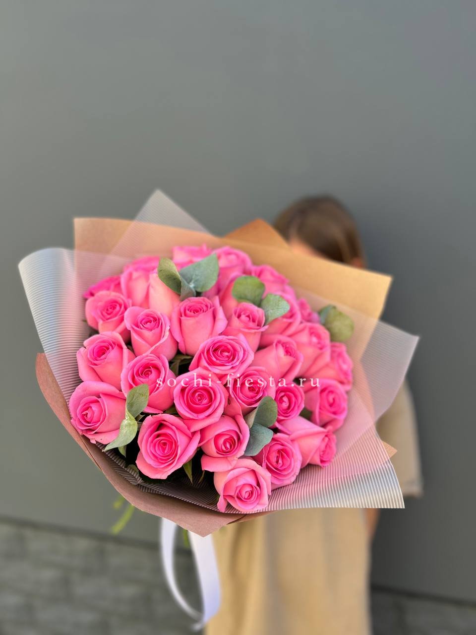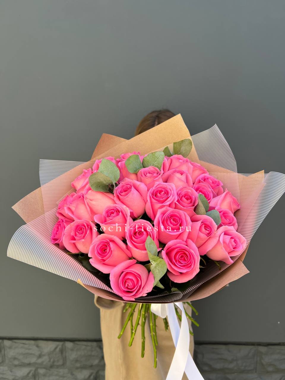 Тридцать одна роза образует пышное облако розового цвета с серебристыми нотами эвкалипта. Крафтовая обертка подчёркивает естественную красоту бутонов и создаёт ощущение лёгкости.
