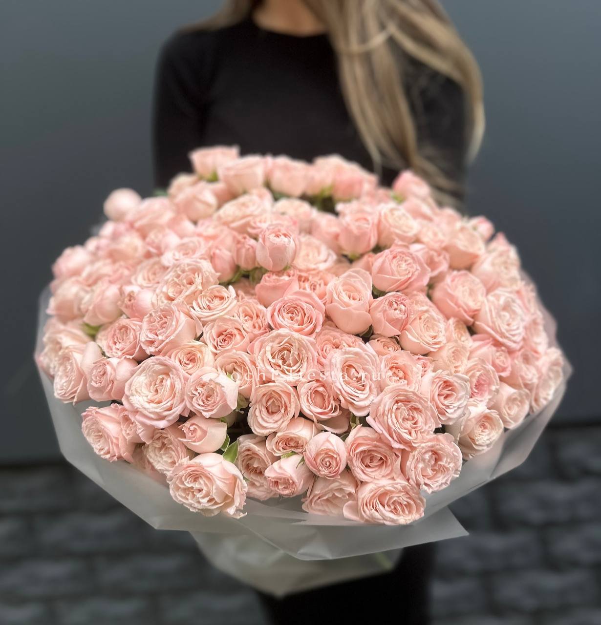 Семь пышных кустовых роз собраны в плотный круг и обрамлены воздушными ветками хамелациума. Бутоны раскрыты почти полностью, создавая объёмную шапку с мягкими переходами оттенков. Композиция держит форму и выглядит самодостаточно.