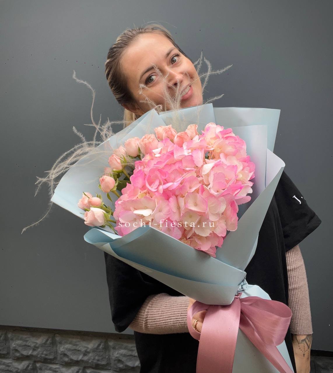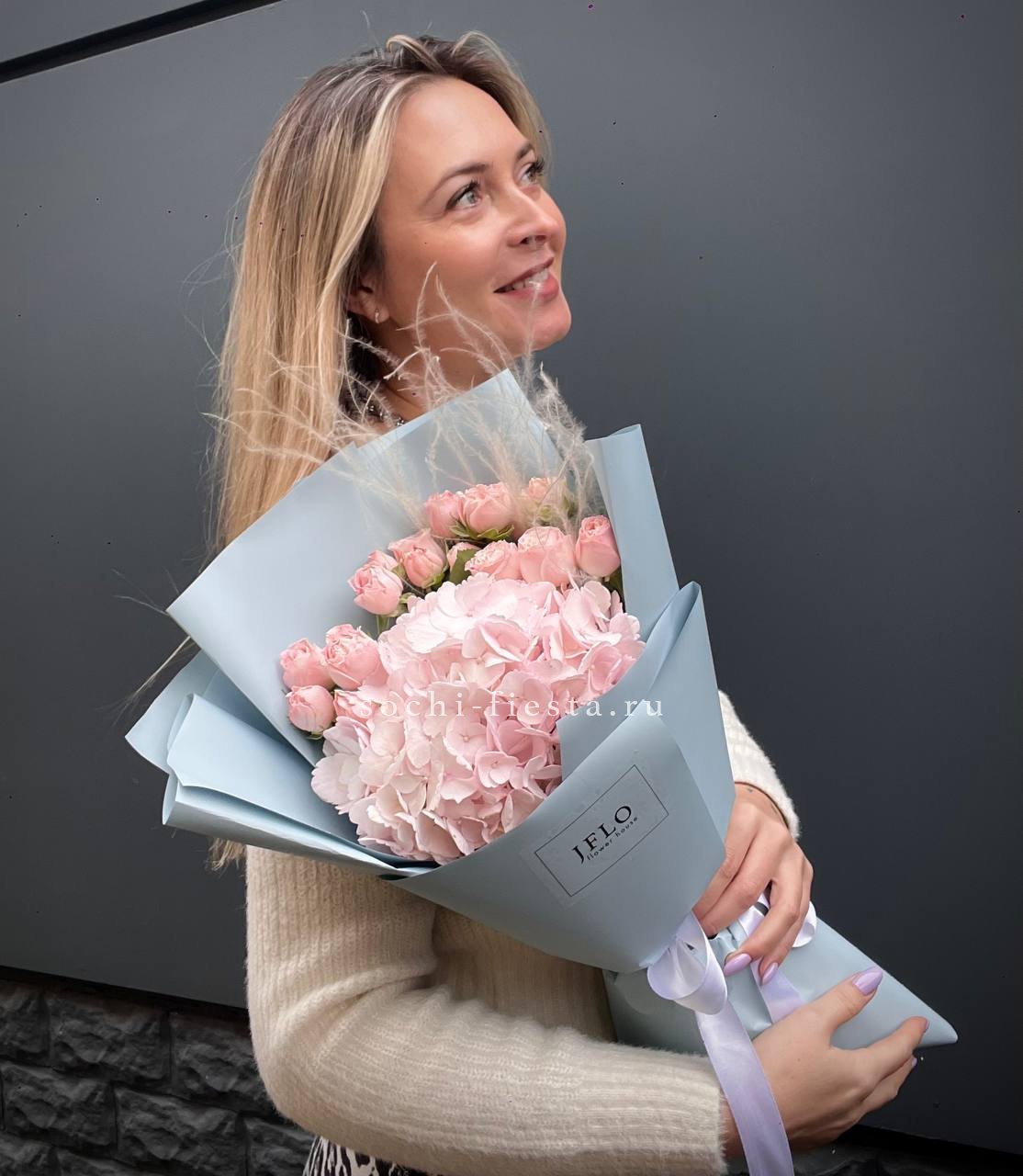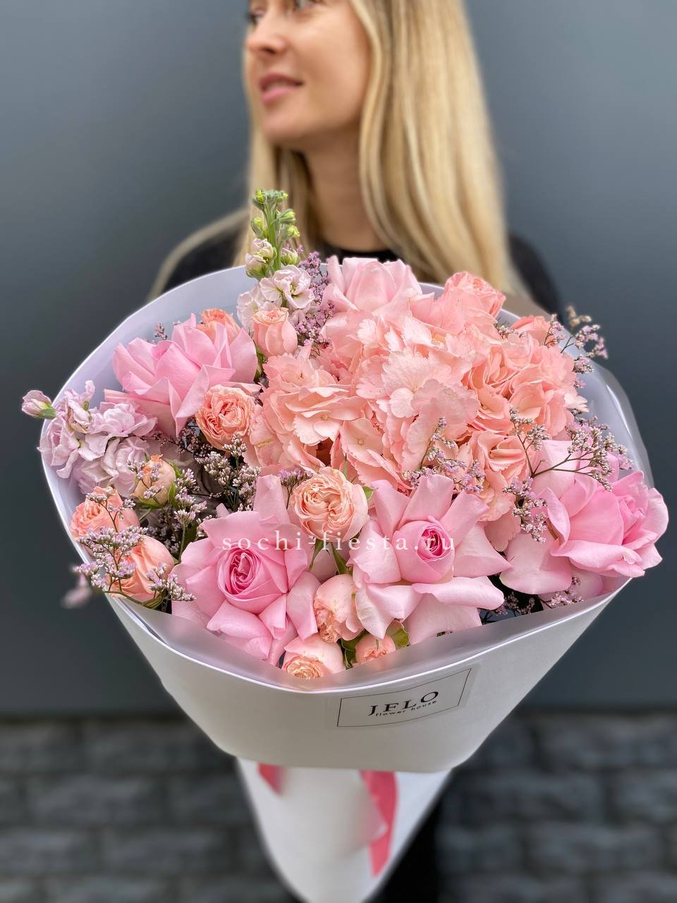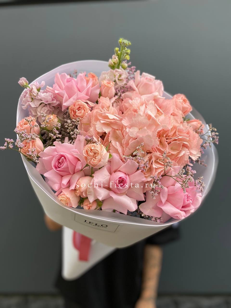 маттиола, розы, гортензия, диантусы, хризантемы , лента и дизайнерская пленка.