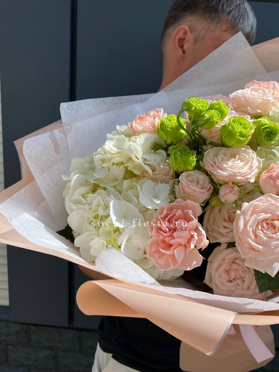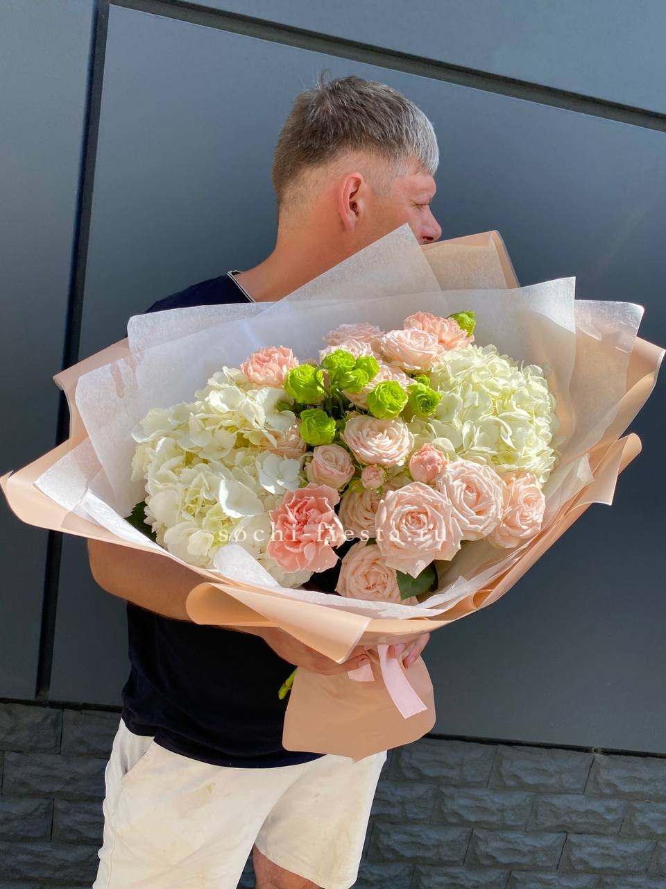 Плотная сборка с пышными соцветиями гортензии и яркими герберами создает объемный силуэт. Маттиола и лимониум добавляют воздушности по краям, а диантусы заполняют центр мягкими переходами.