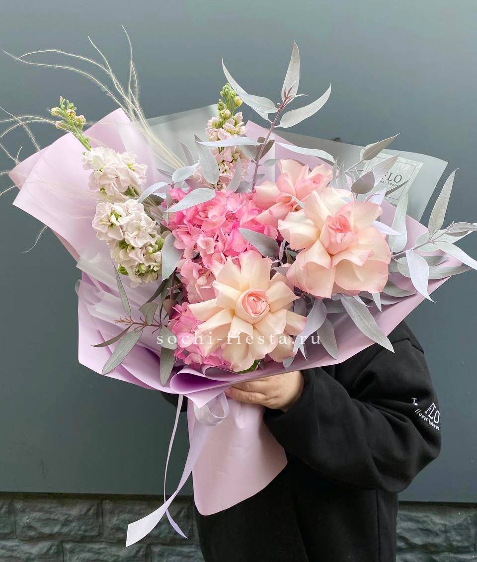французские розы, маттиола, гортензии, эвкалипт, стифа, упаковка, лента.