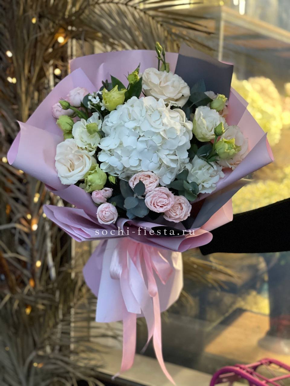 гортензия, хризантема, хамелациум, гербера, мисти баблс, диантус, пленка.