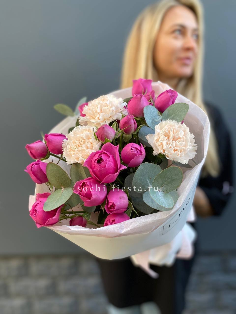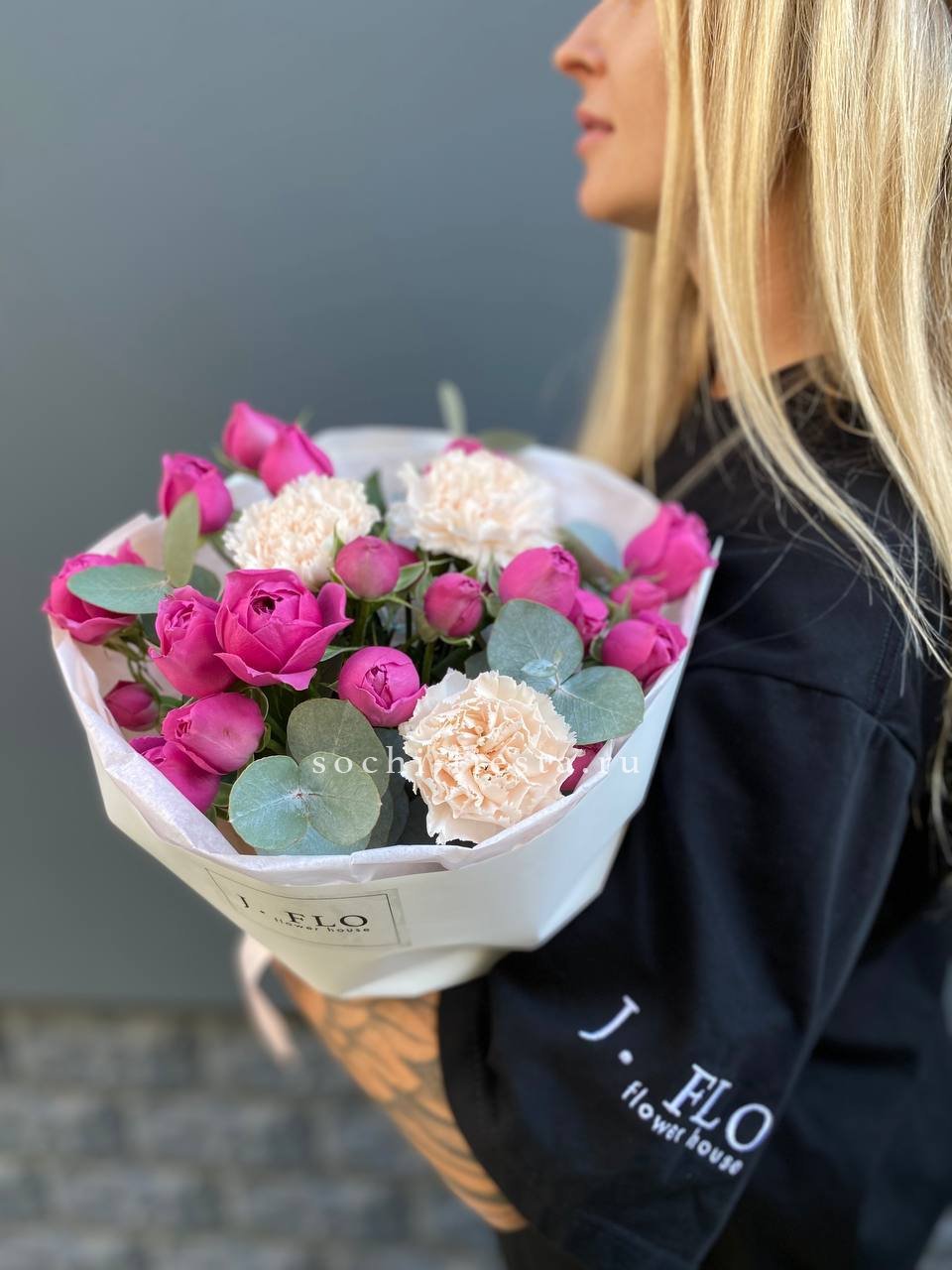 диантус, розы, бомбастик, эвкалипт, упаковка.