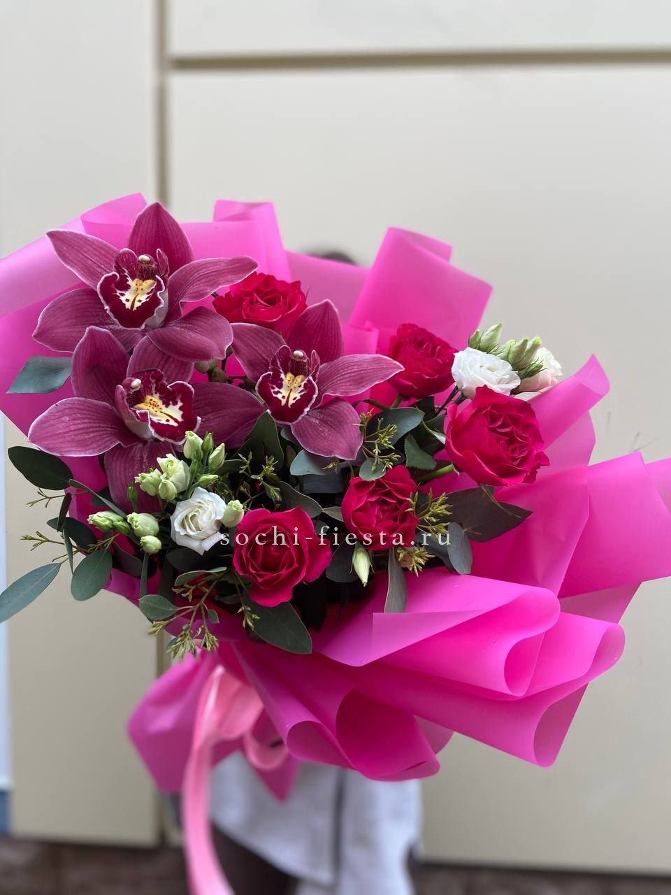 роза, орхидея цимбидиум(или эквивалент),эустома,  эвкалипт, лента, дизайнерская упаковка.