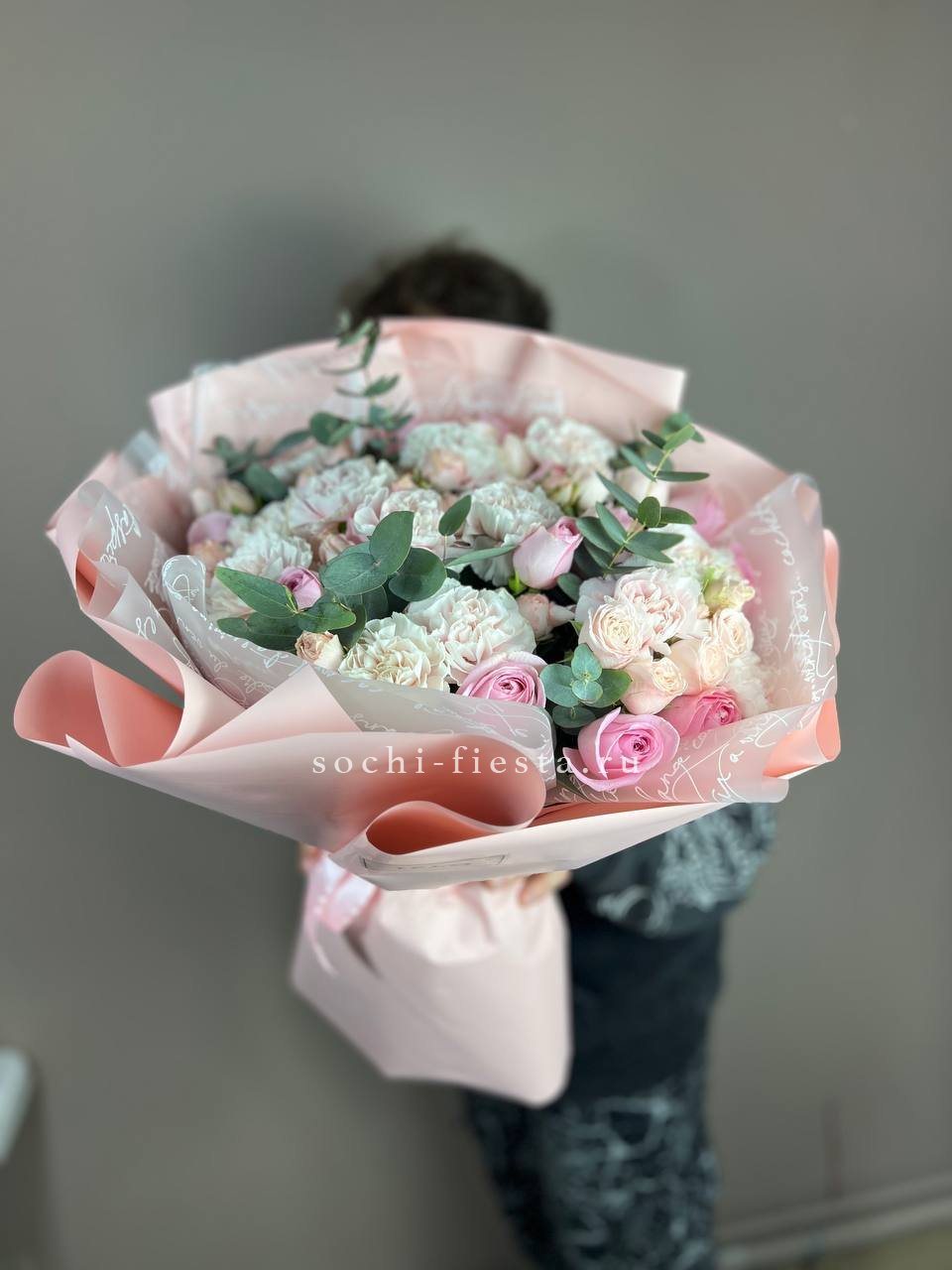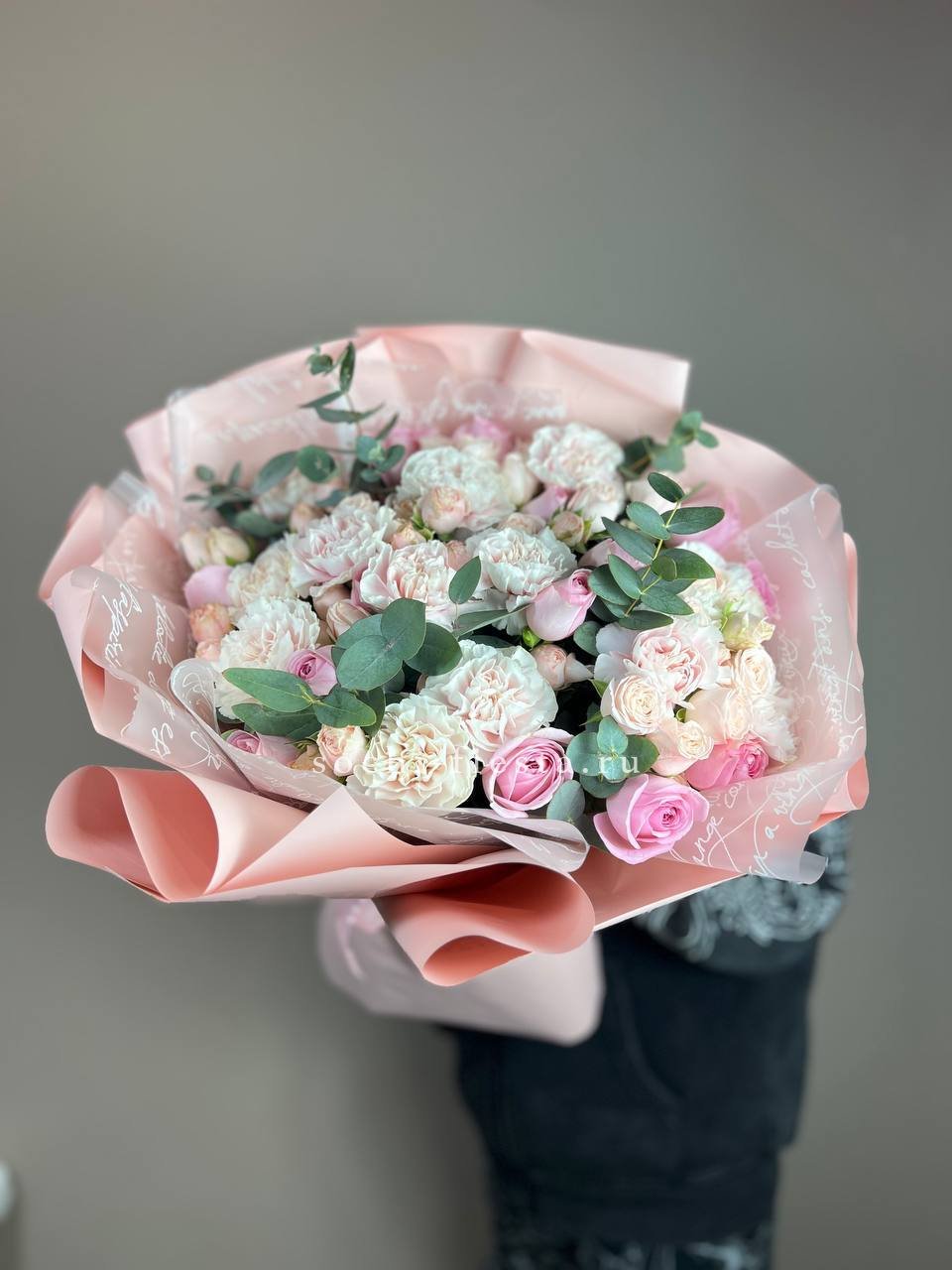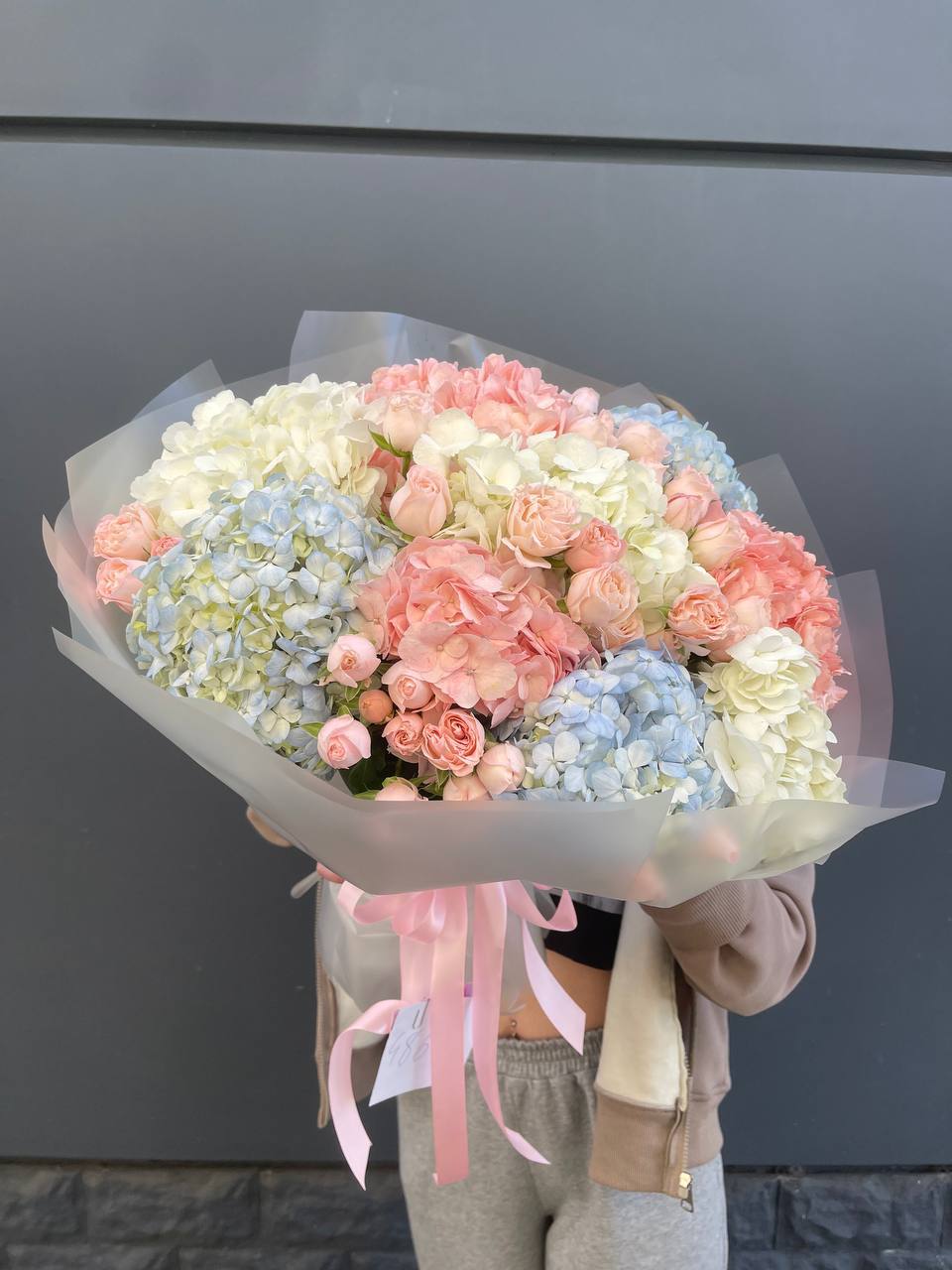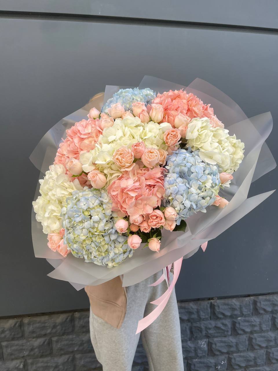 Крупные бутоны Джумилии соседствуют с воздушной гортензией и россыпью кустовых роз. Эвкалипт и хлопок создают спокойный фон для нежной палитры.