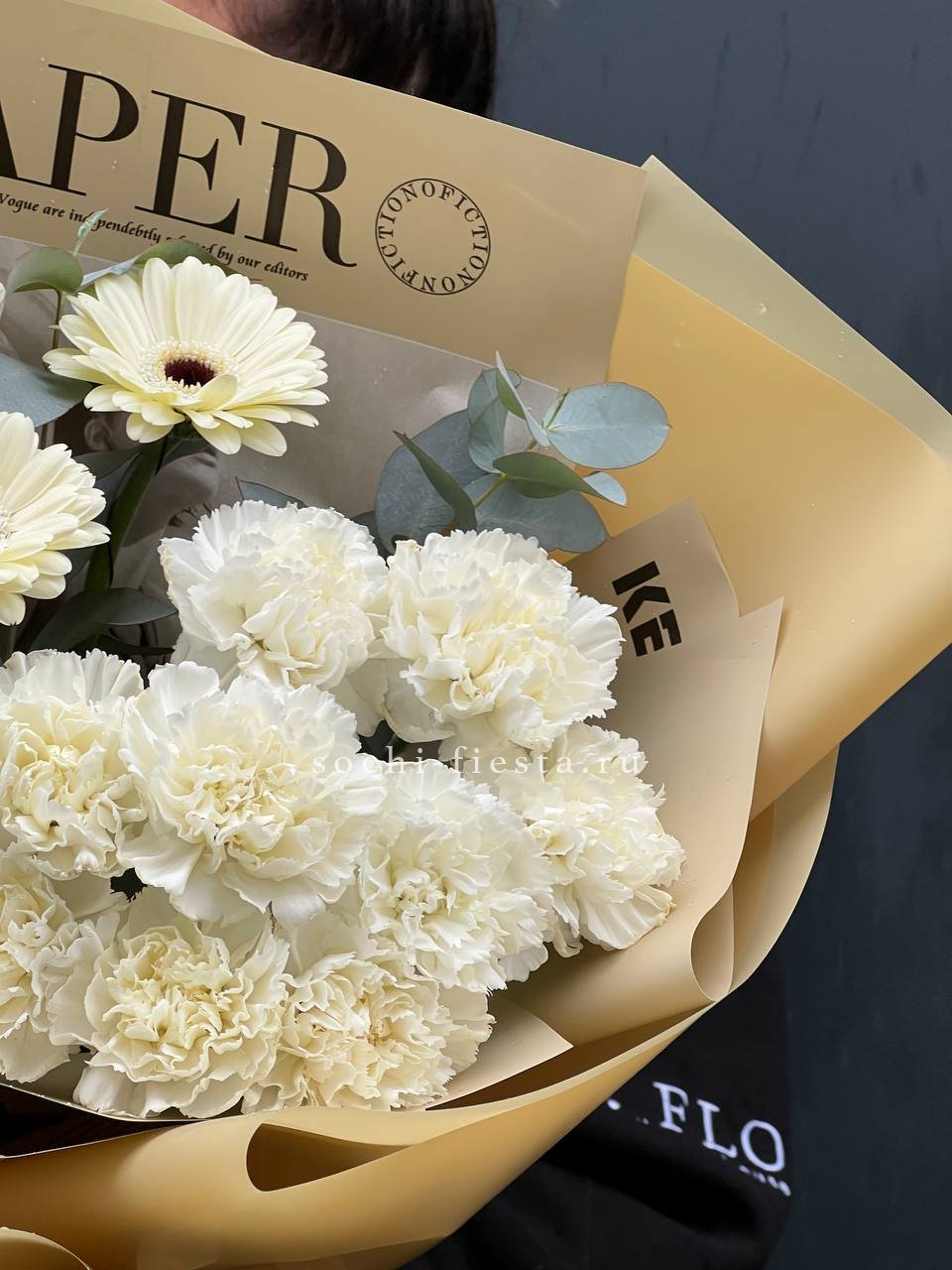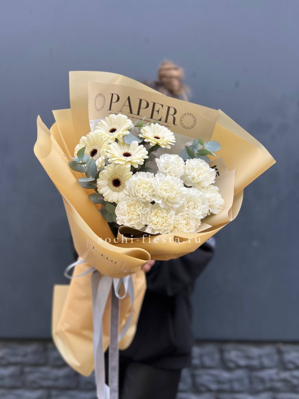герберы, диантус, лента, дизайнерская пленка, тишью.