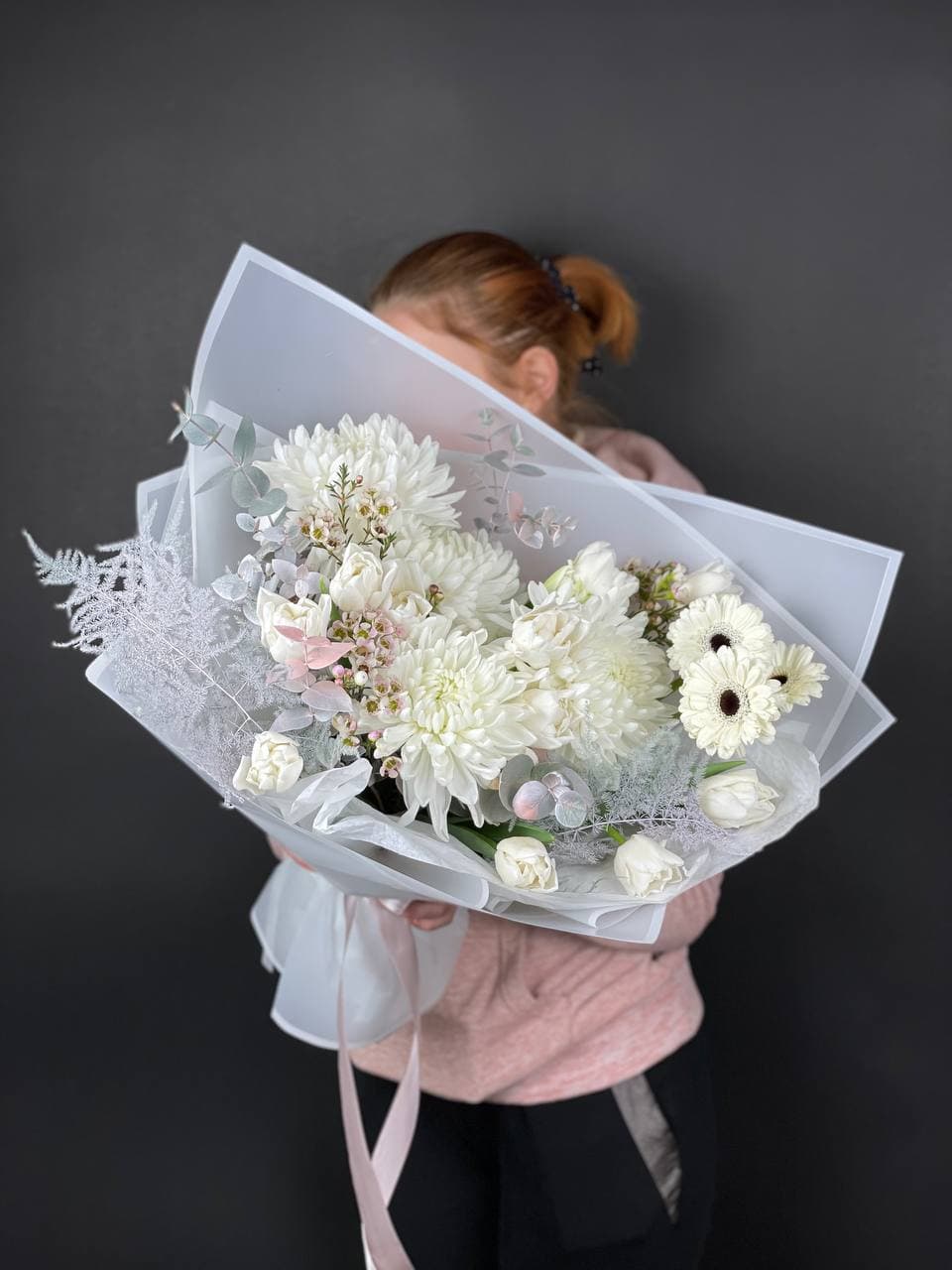 Герберы и хризантемы держат форму долго, не теряя свежести. Эвкалипт и аспарагус придают композиции завершённость, а тюльпаны или пионовидные розы вносят сезонную нотку в структуру букета.