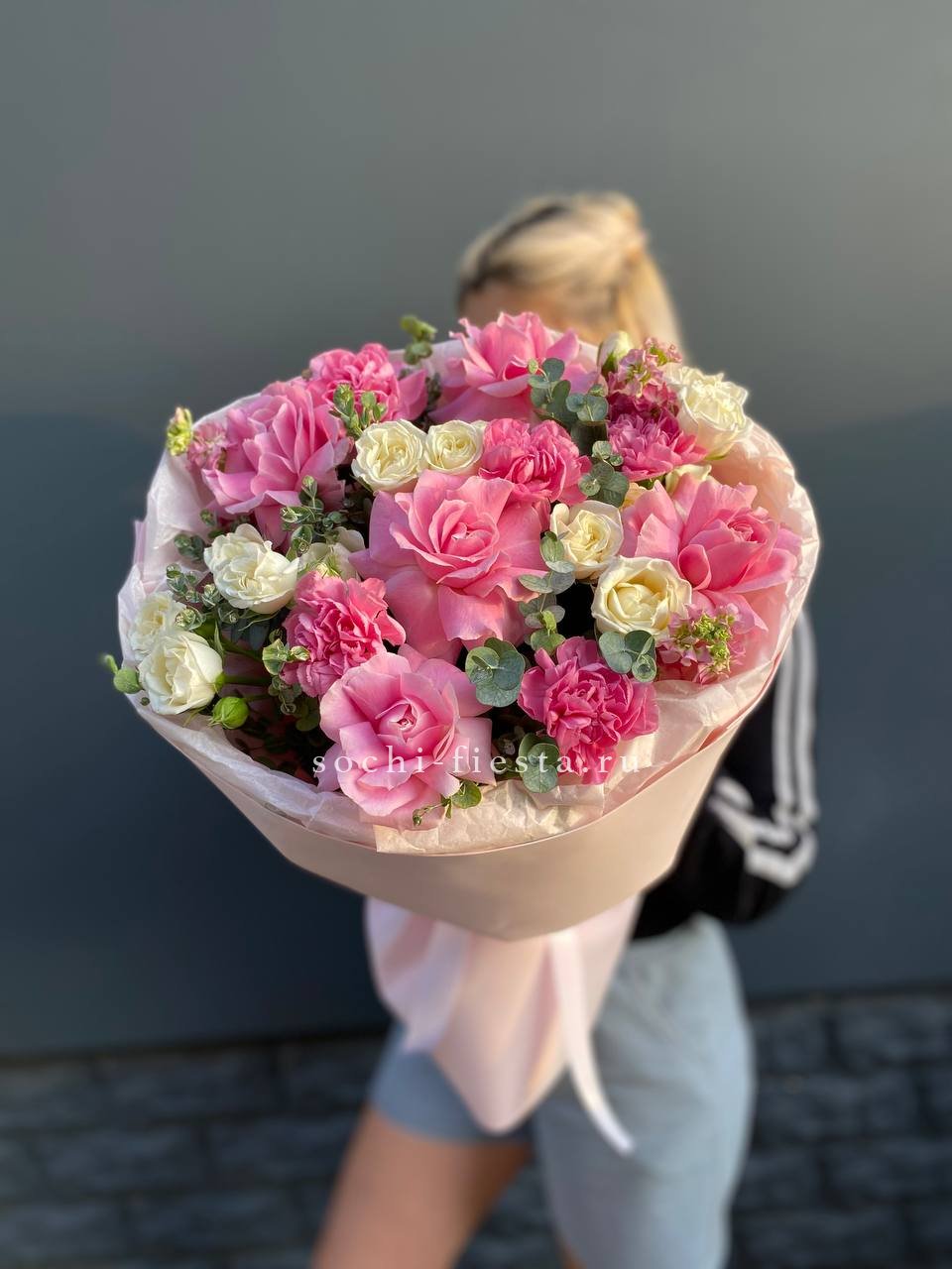 гортензия, кустовая роза, розовая роза, дельфиниум/маттиола/львиный зев, амарантус, эвкалипт или аналог, декор, корейская пленка, лента.