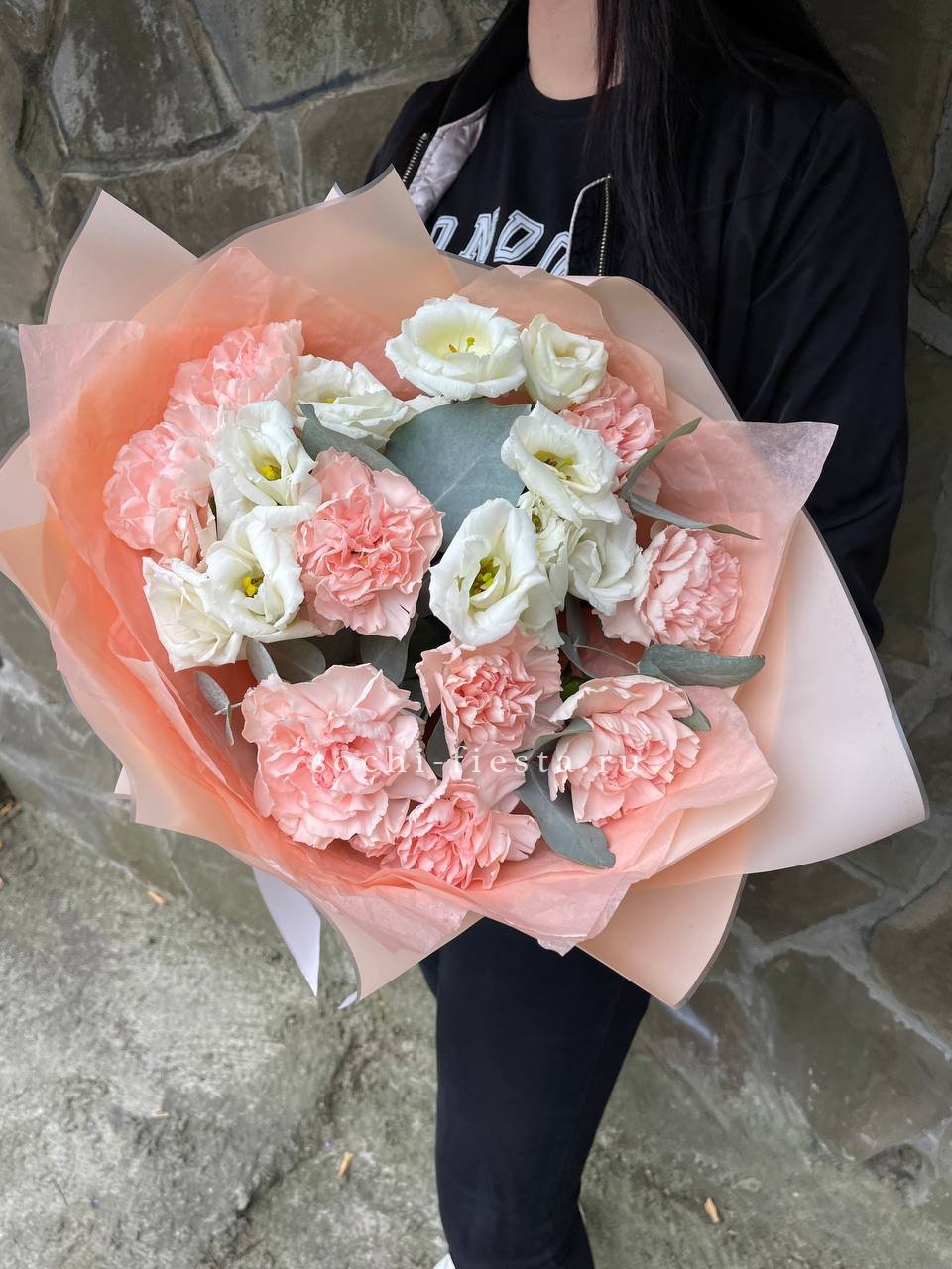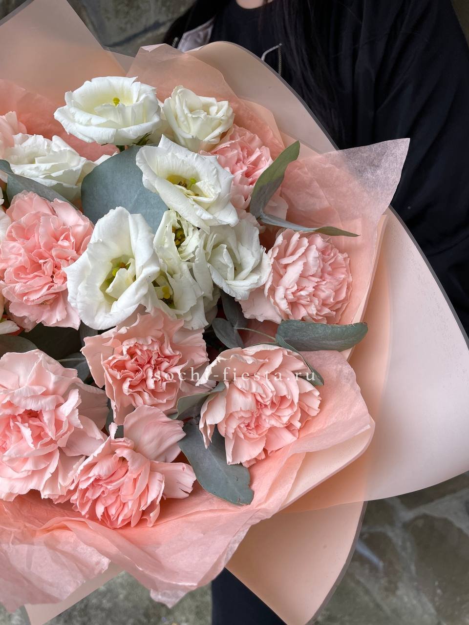 Пионовидные розы и гортензия образуют плотное ядро композиции, а диантус с эустомой разворачиваются по краям. Эвкалипт задает движение и глубину всей формы.