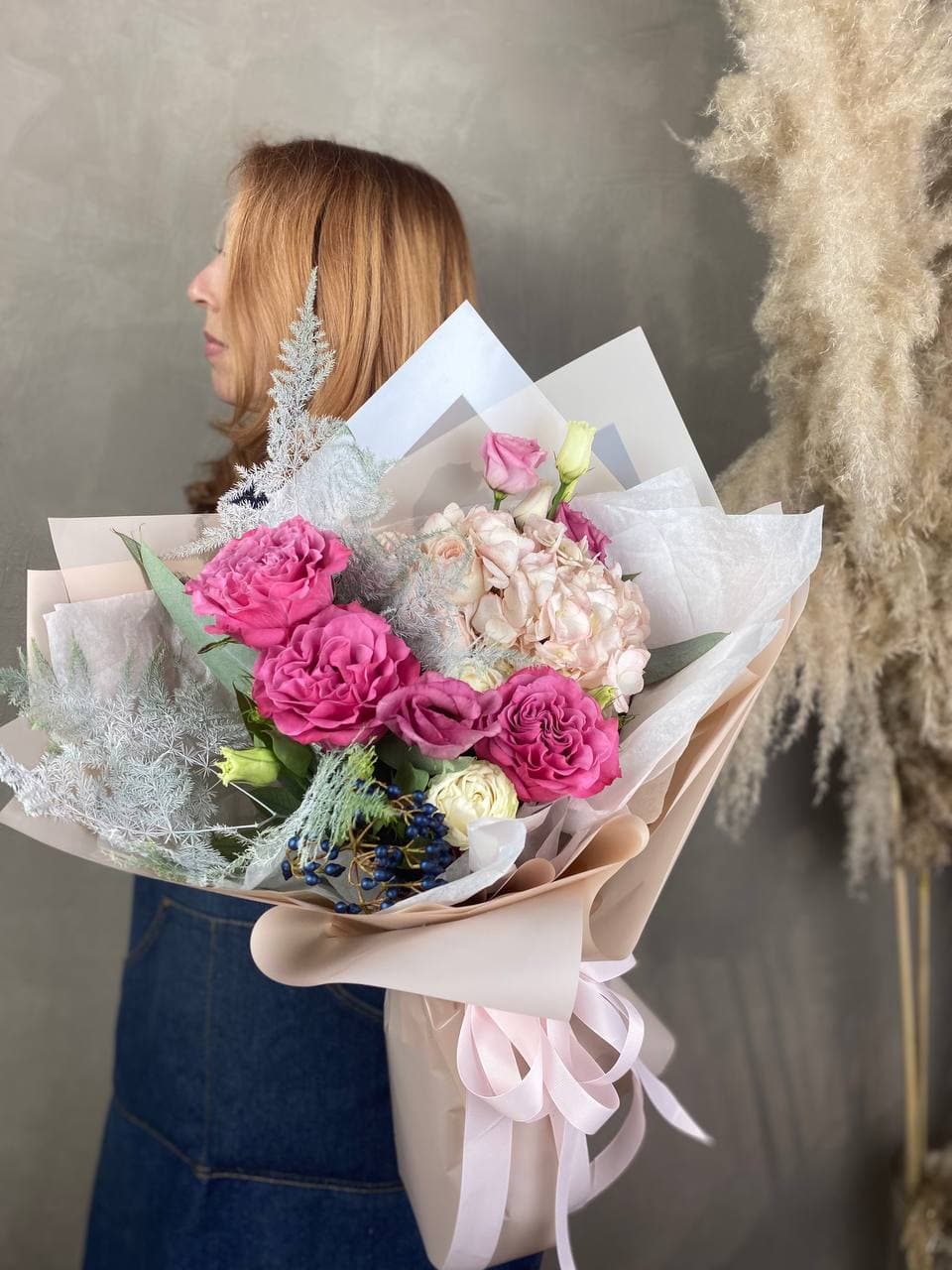 Крупные шапки гортензии задают объем, а пионовидные розы добавляют глубину за счет многослойных лепестков. Эустома вносит легкость, а перистый аспарагус разбивает плотность цветочной массы.