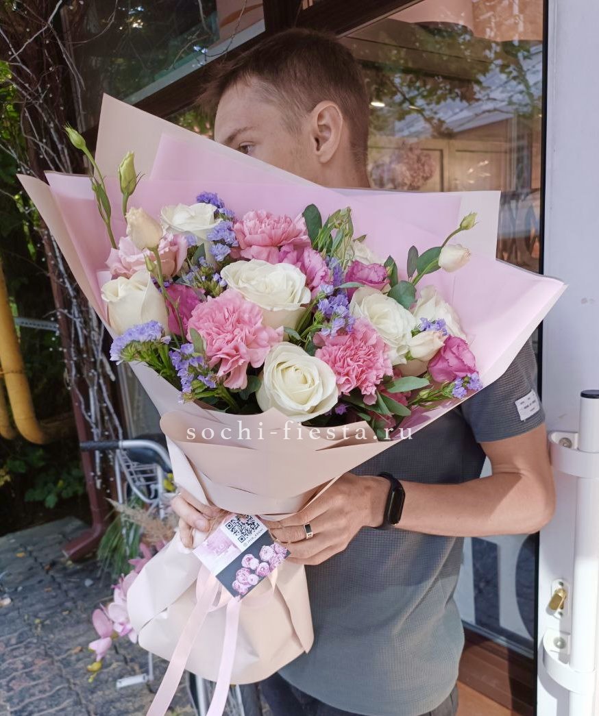 гортензия, диантус, кустовая пионовидная роза, эустома, озотамнус, хамелациум (или аналог) эвкалипт, лента, упаковка.