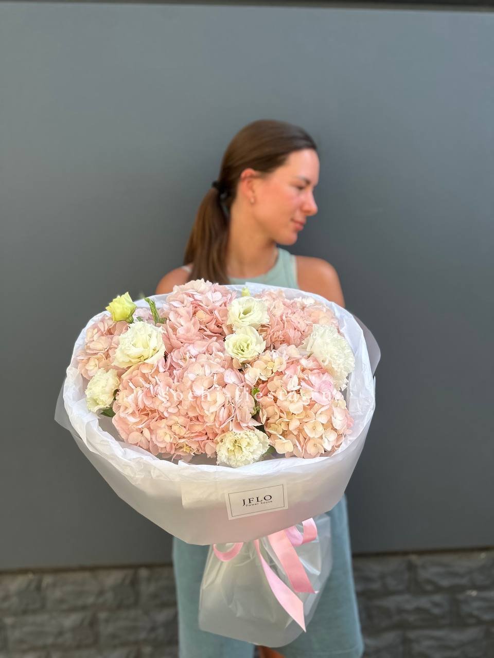 Пышная шапка из гортензии и пионовидных роз собрана с филигранной точностью. Диантус и эустома создают воздушные переходы между крупными соцветиями, а озотамнус добавляет графичные вертикали. Букет для тех, кто понимает язык авторской флористики.