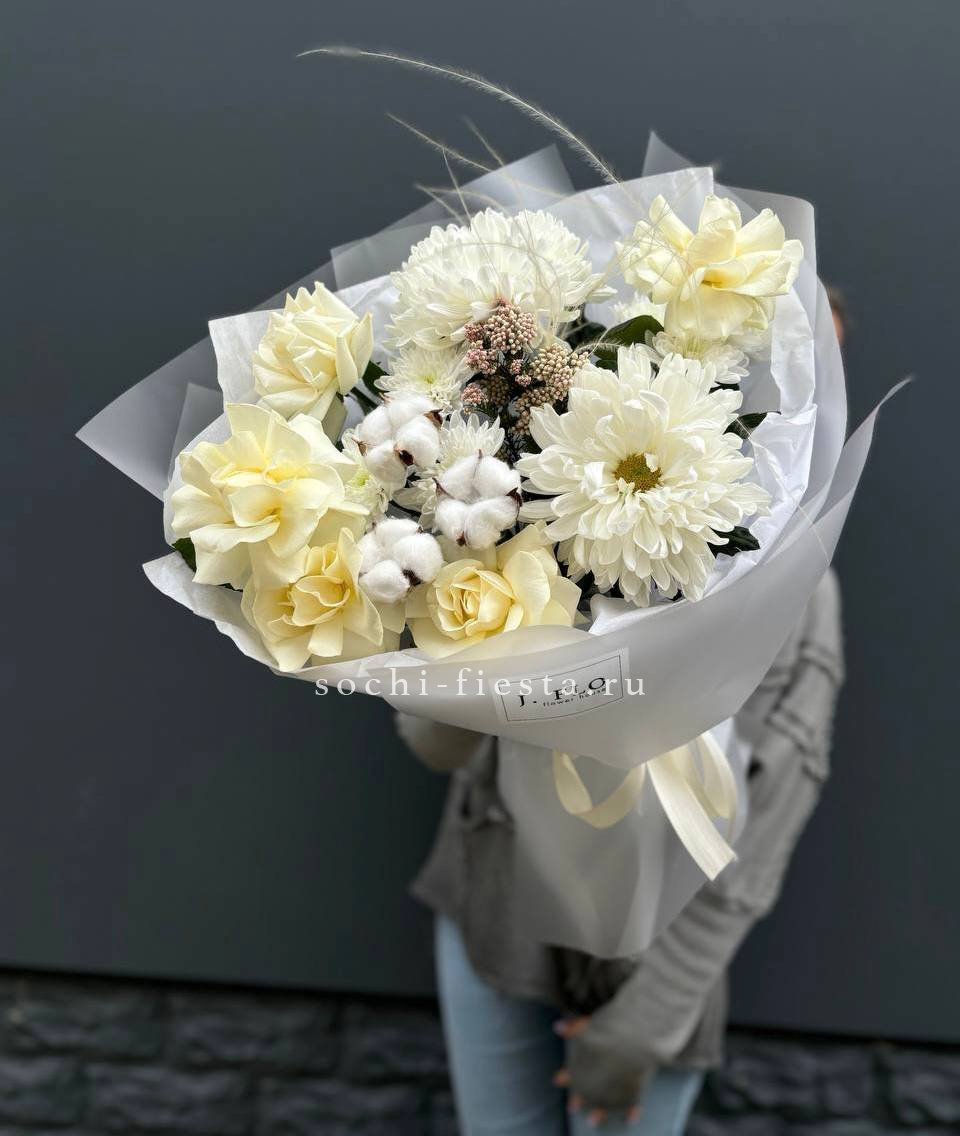 цветочная композиция с применением одноголовых хризантем, белых роз, озотамнуса или аналога, хлопка.