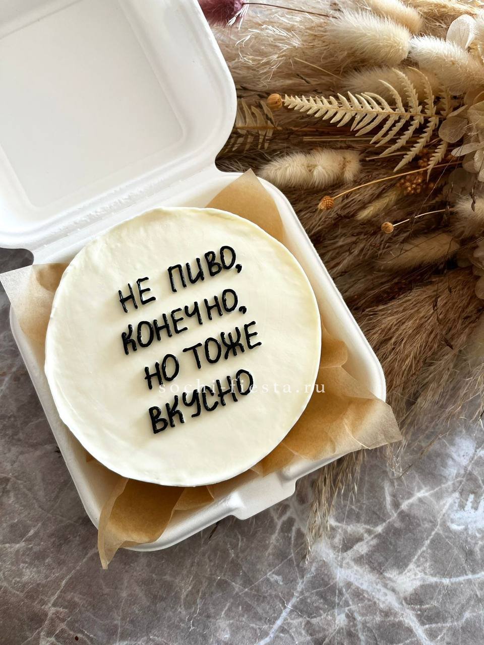 Миниатюрный торт с яркой надписью и домашним теплом в каждом слое. Крем держит форму, а бисквит остается влажным благодаря небольшому объему и свежести выпечки.